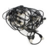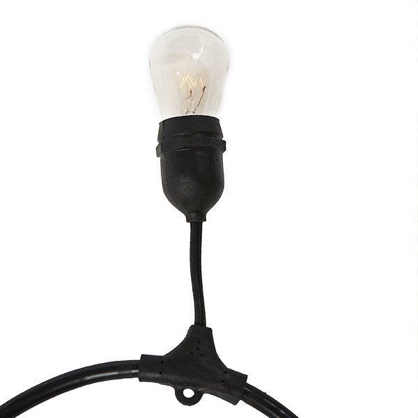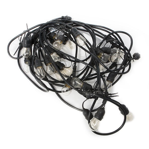 Strand market type lighting that has bare bulbs that give off a soft white light.